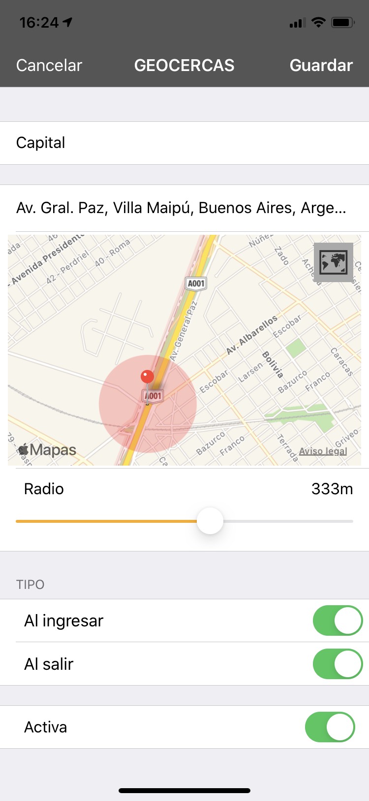 Pueden definirse cercas virtuales de inclusión o exclusión por cada miembro que serán reportadas por mensajes push.