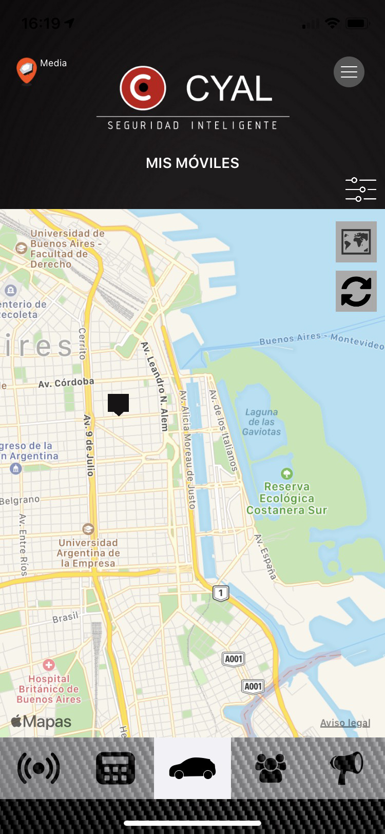 El usuario puede acceder a la posición de todos sus vehículos en el mapa, conectados vía GPS al centro de monitoreo, visualizar historial de posiciones, eventos recibidos, matrícula, fotografía del móvil y mas.